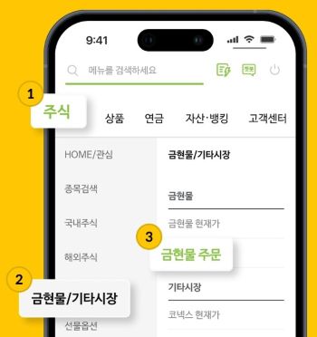 나무 앱 접속 후, 홈 화면 좌측 하단 메뉴(三) 버튼 클릭, ①②③주식 → ①②③금현물 / 기타 시장 → ①②③금현물 주문 클릭 후 모바일 계좌 개설하면 끝입니다.