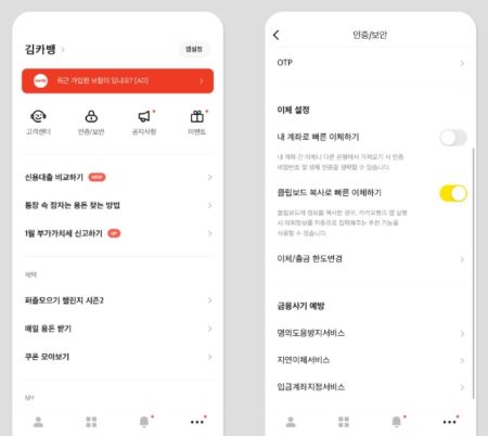 ① 카카오뱅크 앱을 열고 전체 메뉴 상단에서 [인증/보안]을 선택합니다.