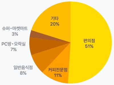 카카오페이 소비쿠폰 사용 횟수가 가장 많은 업종은 편의점이었습니다. 전체 사용 건수의 51%가 편의점에서 발생했고, 1회 사용 시 평균 결제 금액은 1만 690원이었습니다. 다음으로 커피전문점(11%), 일반음식점(8%) 이 순위에 올랐습니다. 카페이서는 건당 평균 6,600원, 음식점에서는 건당 평균 3만 900원을 결제했습니다.
