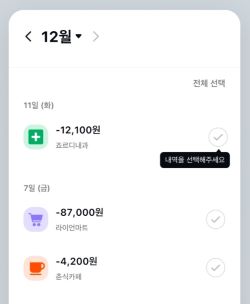 연말정산은 내가 한 해 동안 받은 월급과 지출내역을 계산해 세금을 돌려받거나 추가로 내는 절차를 말합니다. 지출한 항목에 대한 증명이 필요할 때는 거래내역서를 발급합니다. 날짜를 설정하거나 가맹점 이름으로 검색한 후, 필요한 내역을 선택하면 메일로 거래내역서를 받을 수 있습니다.
