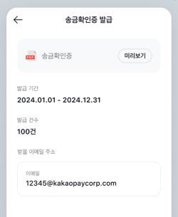 송금 내역에서 날짜와 받는 사람을 설정하고 필요한 내역을 선택하면 이메일로 송금확인증을 받을 수 있습니다.