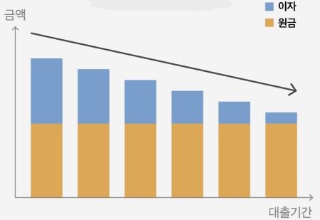 대출 원금을 대출 기간 중 똑같이 나눠 갚는 방식입니다.
