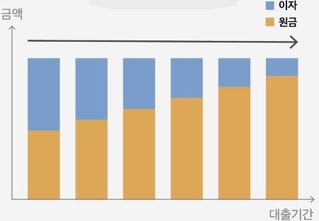 대출 원금과 이자를 더한 총액을 만기일까지 매달 똑같이 나눠 갚습니다. 먼저 이자와 원금을 모두 더한 값을 대출기간(월)으로 나눈 뒤, 이를 기준으로 원금과 이자의 비율을 조정합니다.장점은 매달 갚아야 할 상환액(원금+이자)이 일정하다는 것입니다. 월급이 일정한 직장인이 재정 계획을 안정적으로 세우기 편합니다. 단점은 대출기간 끝나는 시점까지 원금 상환 부담이 크다는 점입니다. 대출 초기엔 상환액 중 이자 비중이 높다가, 점차 원금 비중이 높아지는 구조이기 때문입니다.